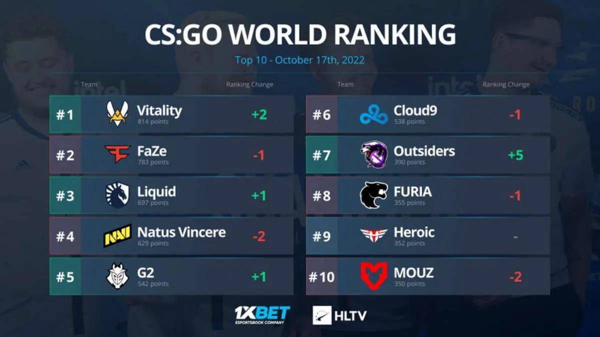 Dank des jüngsten Sieges beim ESL Challenger auf der DreamHack Rotterdam 2022 und dem Einzug in den Major kehrte das Outsiders-Team in die TOP-10 der Stärksten zurück und belegte die siebte Reihe. Außerdem flog das Team Ninjas in Pyjamas aus den Top Ten.